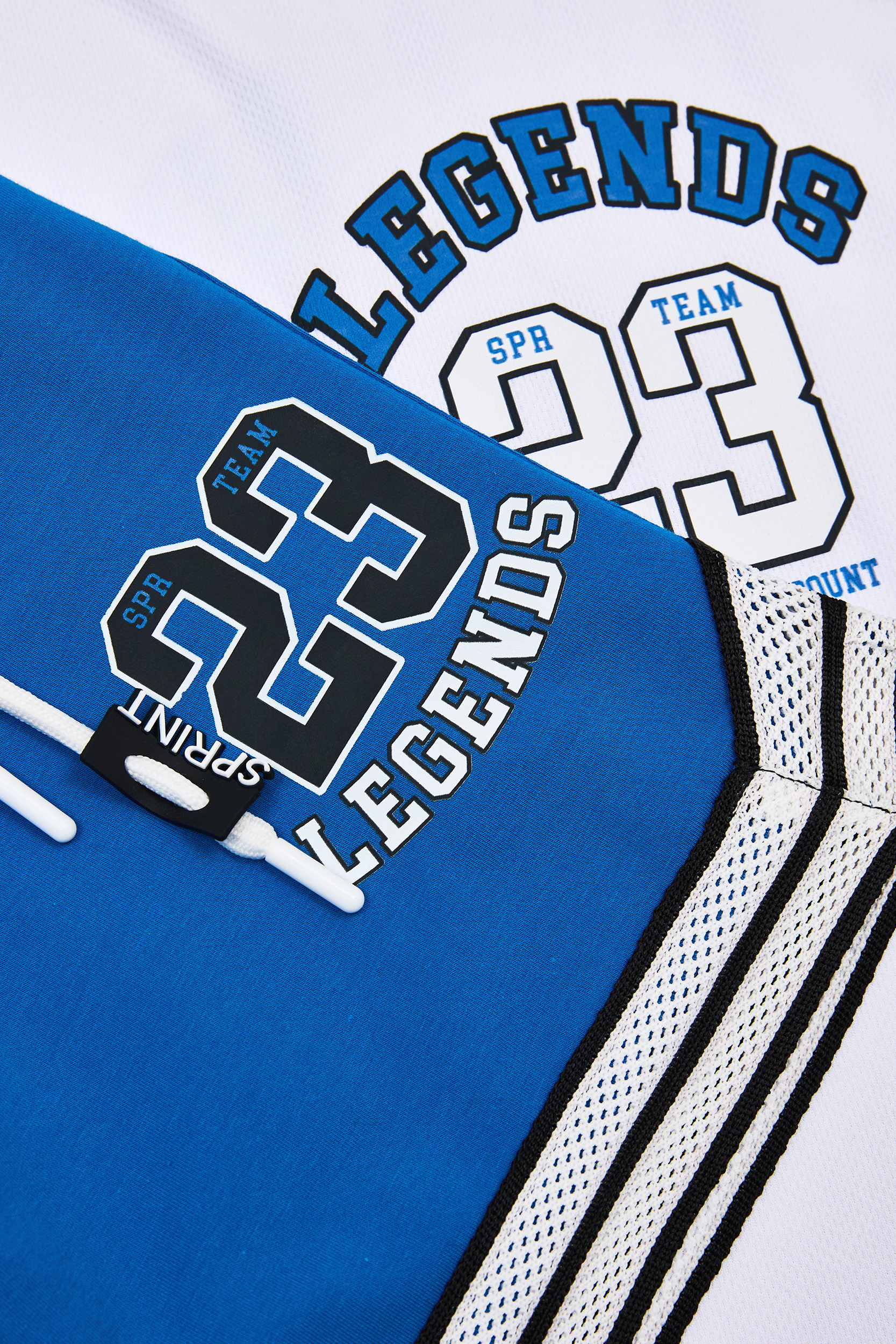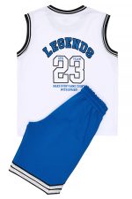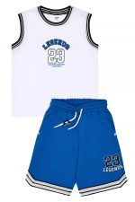 - Παιδικό σετ 2 τεμαχίων. Μπλούζα αμάνικη μπασκετική, Tech Sport Mesh με τύπωμα “Legends” μπροστά και στην πλάτη με δίχρωμες φάσες ρίμπ στον λαιμό και μασχάλες. Αθλητική βερμούδα φούτερ με ελαστικό ζωνάρι και ρυθμιζόμενα κορδόνια με rubber διακοσμητική ετικέτα, μπροστινές λοξές τσέπες και αθλητικές φάσες στο κάτω μέρος με τύπωμα.