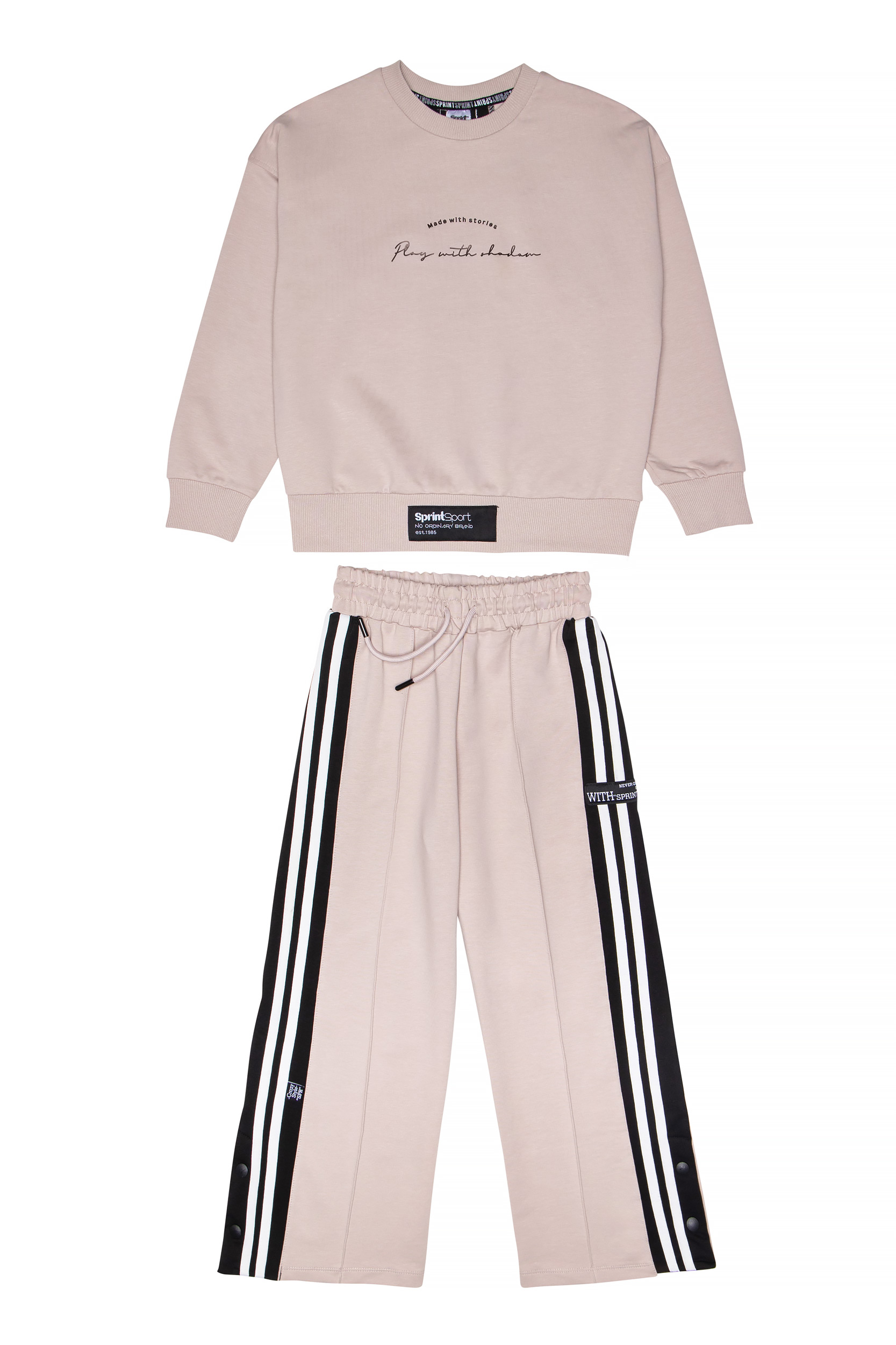 - Παιδικό σετ 2 τεμαχίων φούτερ χωρίς χνούδι. Μπλούζα με στρογγυλή λαιμόκοψη και τύπωμα εμπρός με ανάγλυφη υφή. Αθλητικές δίχρωμες φάσες στην πλάτη και στο παντελόνι με απλικέ ετικέτα SPRINT. Ίσιο παντελόνι με ελαστικό ζωνάρι και ρυθμιζόμενα κορδόνια με τρούκ στο κάτω μέρος.