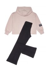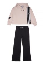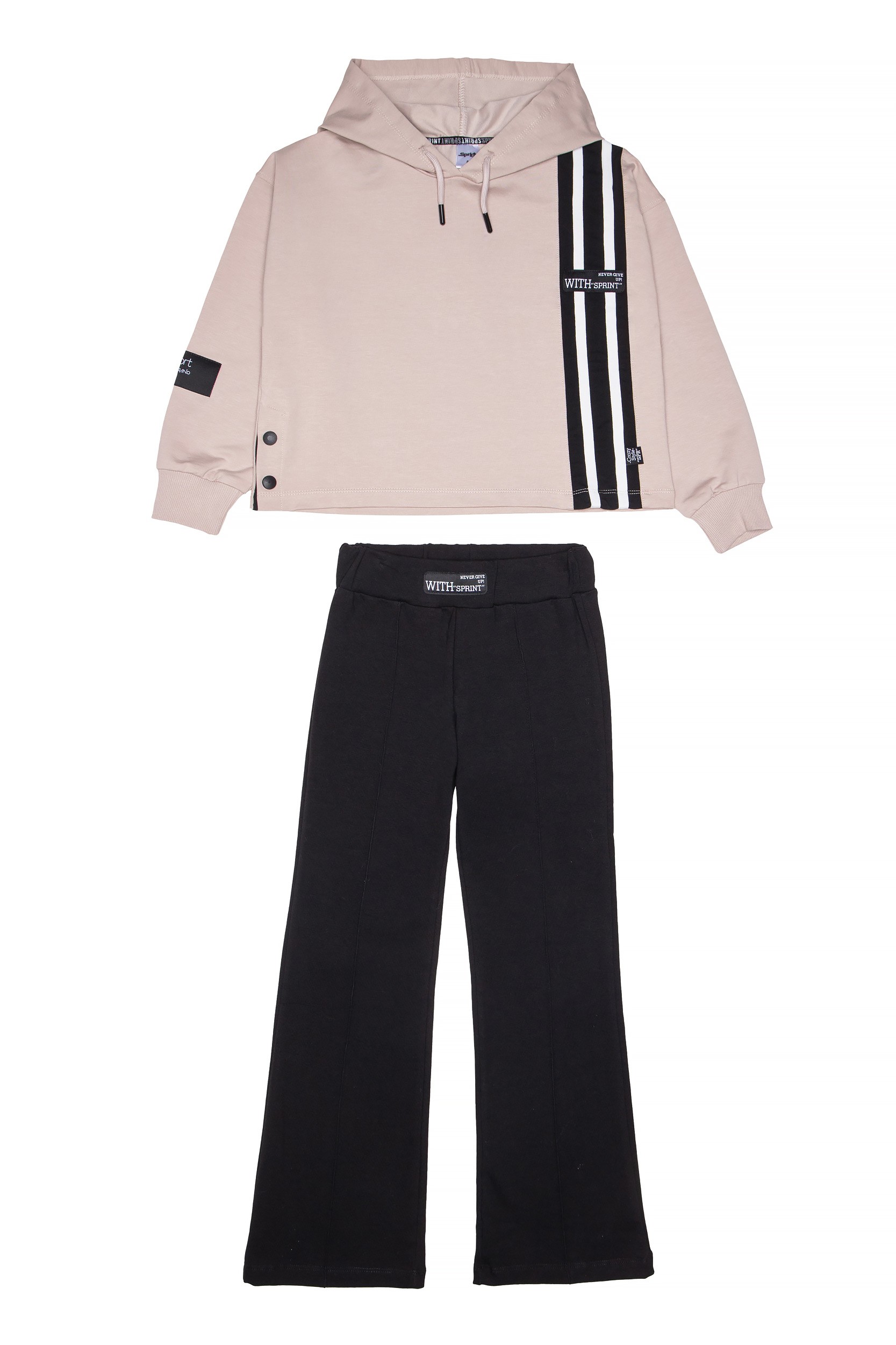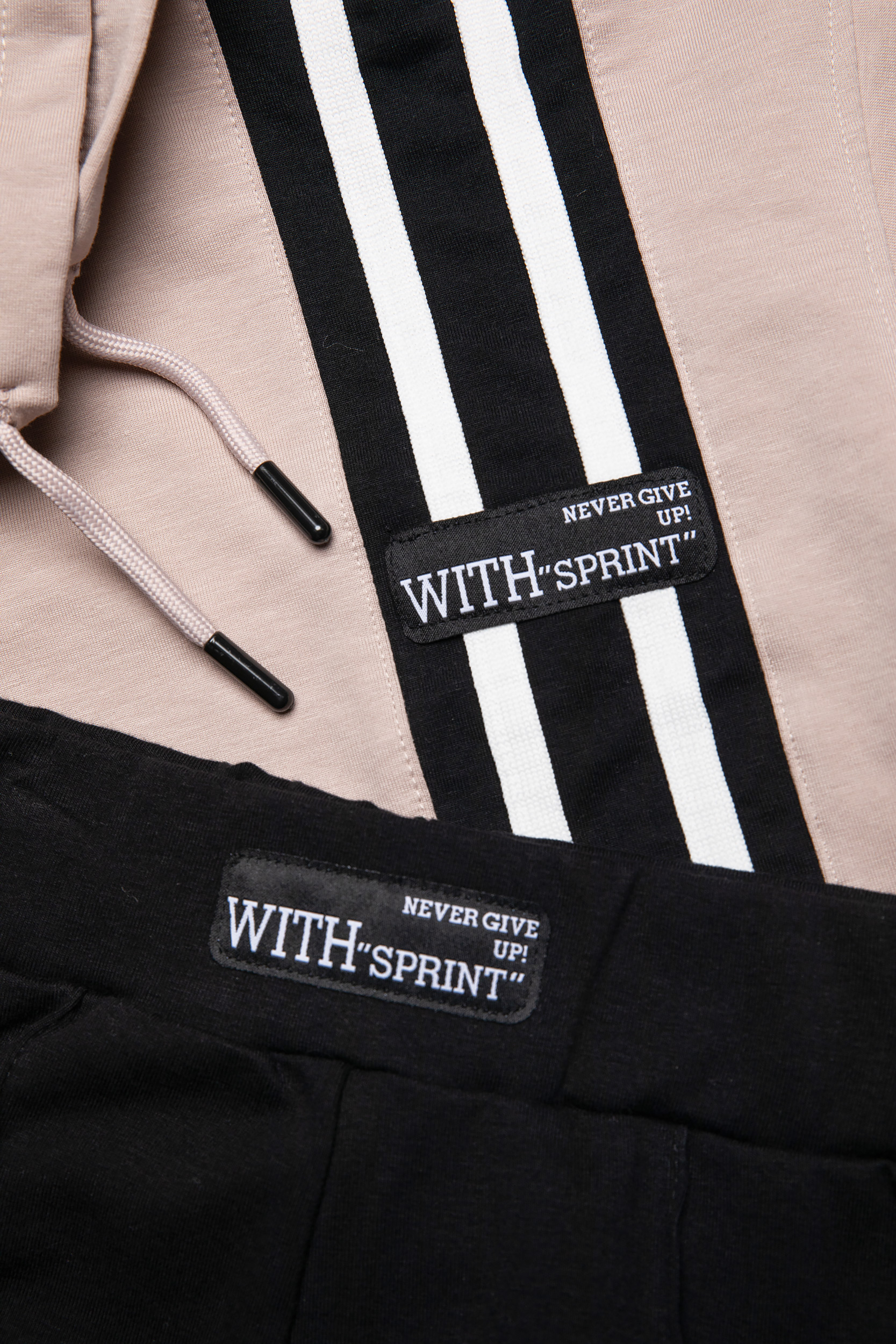 - Παιδικό σετ 2 τεμαχίων φούτερ χωρίς χνούδι. Μπλούζα με κουκούλα με δίχρωμη αθλητική φάσα με απλικέ ετικέτα SPRINT και άνοιγμα με τρούκ στο πλάι. Κολάν τύπου καμπάνα.