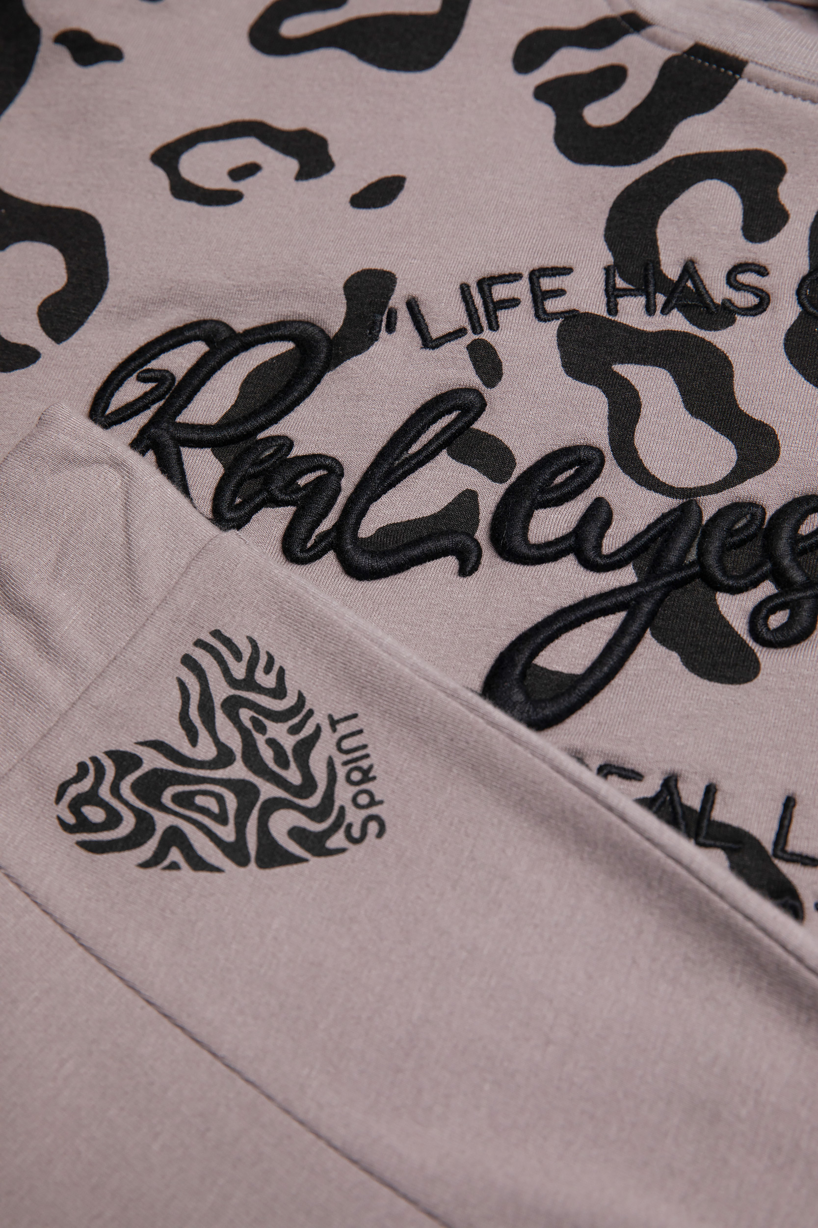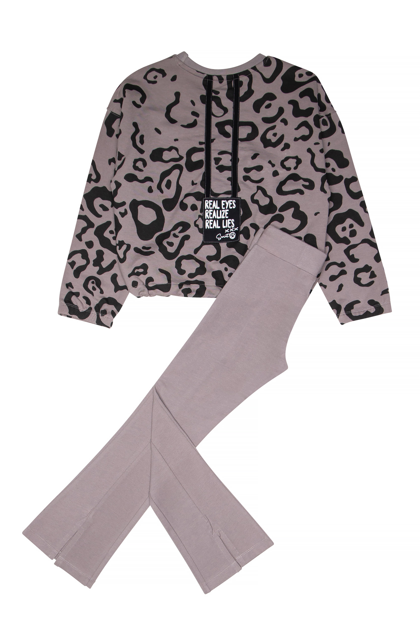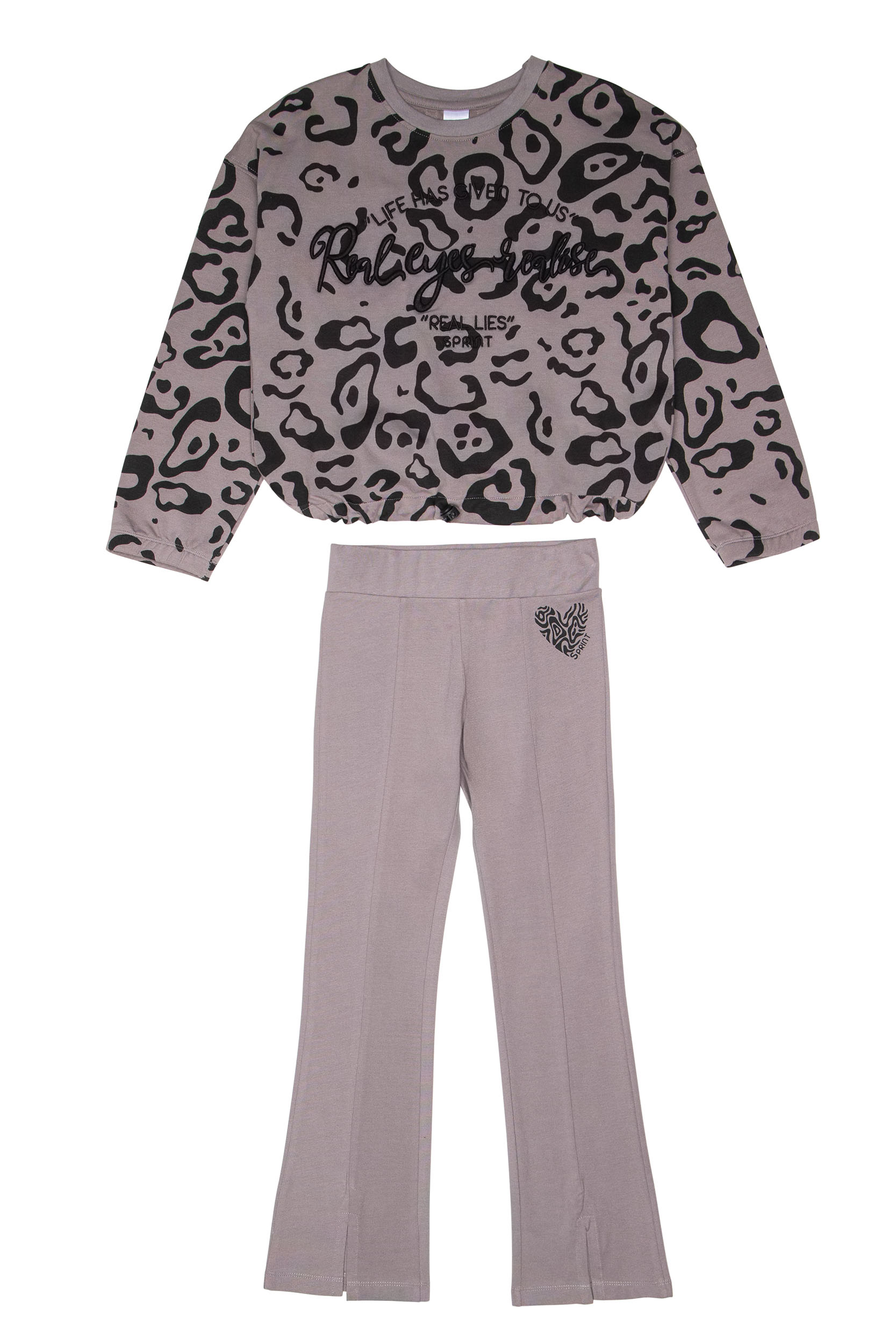 - Παιδικό σετ 2 τεμαχίων. Μπλούζα φούτερ λύκρα με χνούδι με στρογγυλή λαιμόκοψη και allover animal print, κέντημα με ανάγλυφη υφή και αθλητικές φάσες στην πλάτη με απλικέ ετικέτα. Λάστιχο στο κάτω μέρος με stop αυξομείωσης. Κολάν λύκρα τύπου καμπάνα με ανοίγματα και τύπωμα καρδιά.