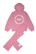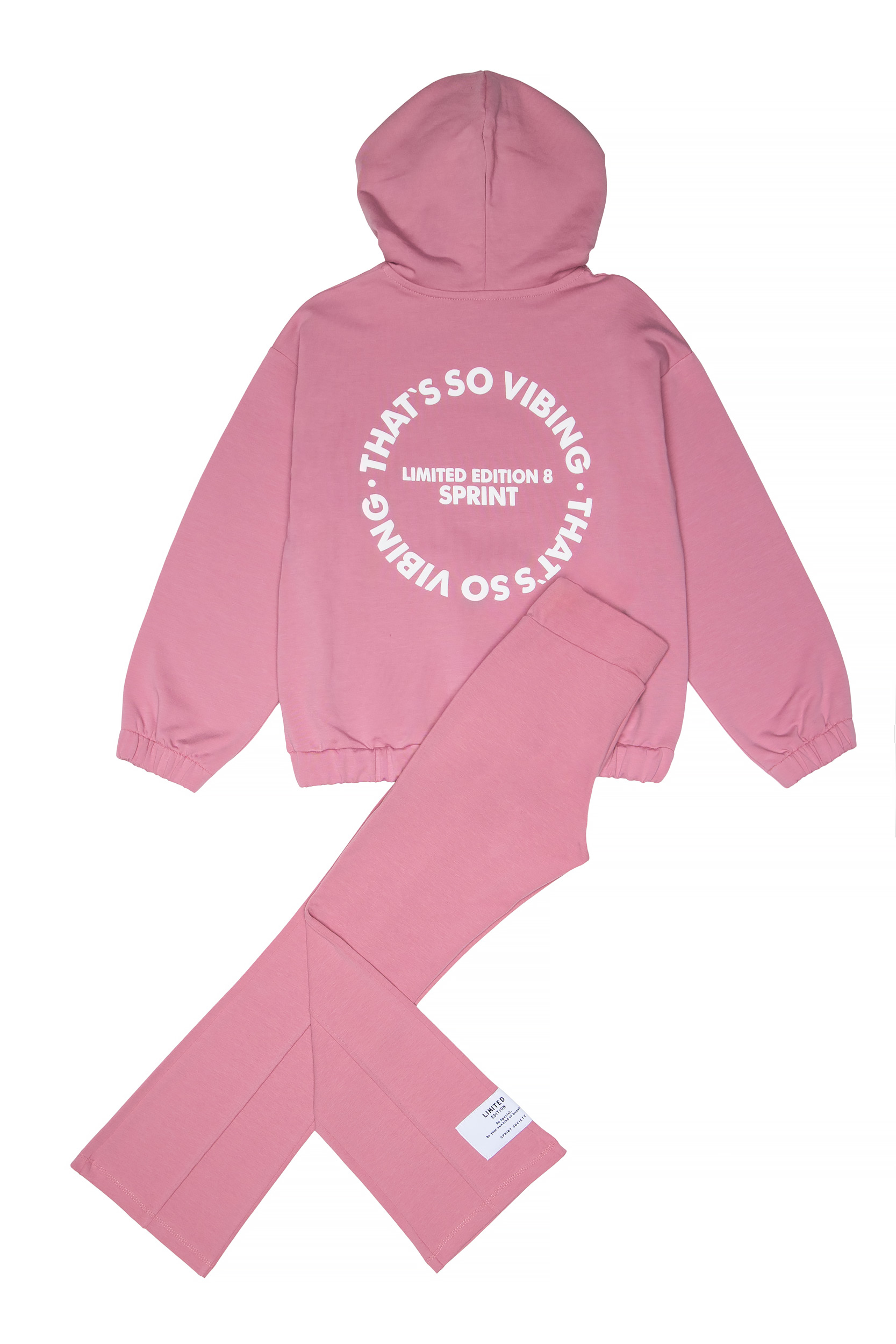 - Παιδικό σετ 2 τεμαχίων λύκρα. Μπλούζα με κουκούλα και τσέπη με τύπωμα μπροστά και στην πλάτη με ανάγλυφη υφή. Κολάν τύπου καμπάνα με απλικέ ετικέτα.