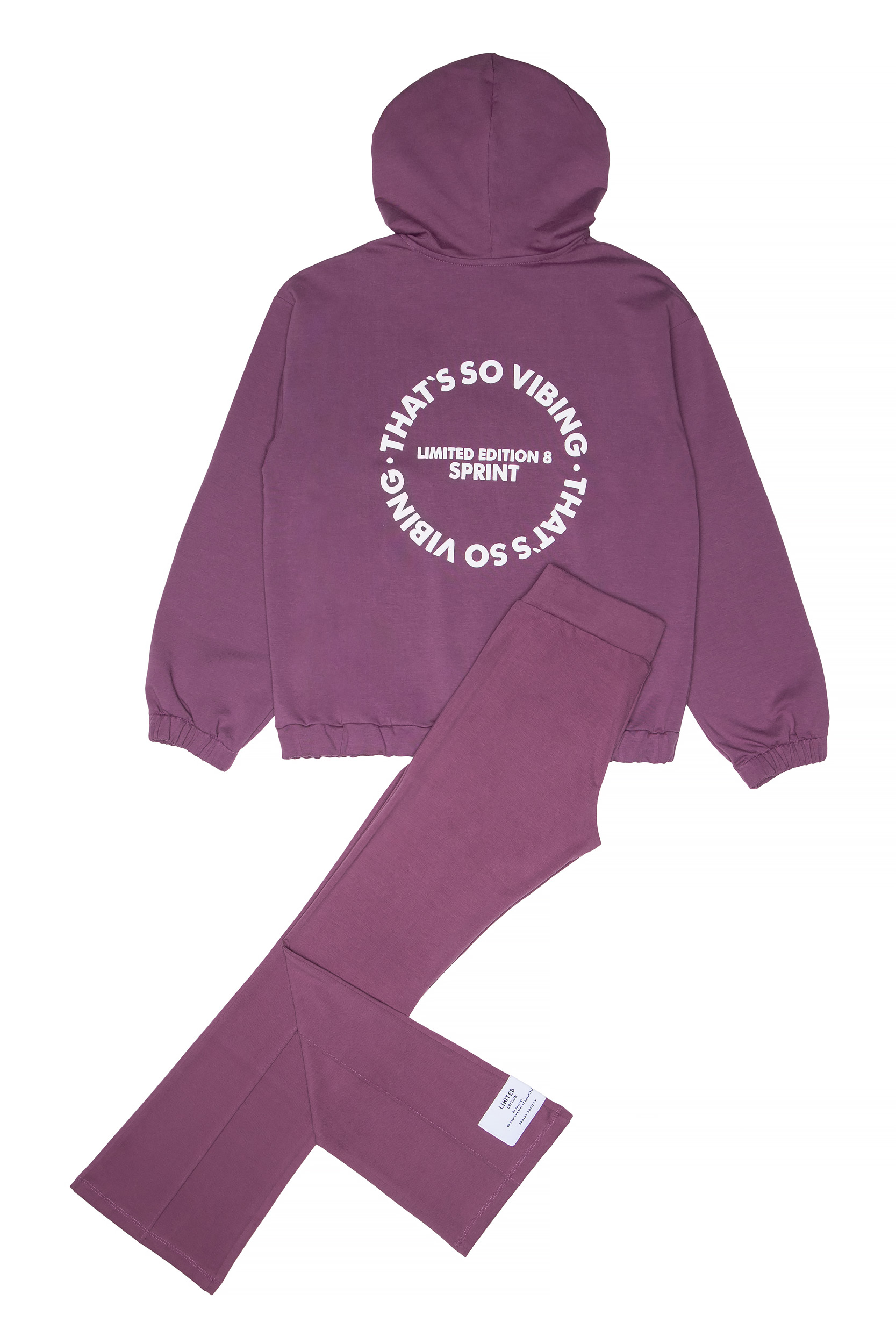 - Παιδικό σετ 2 τεμαχίων λύκρα. Μπλούζα με κουκούλα και τσέπη με τύπωμα μπροστά και στην πλάτη με ανάγλυφη υφή. Κολάν τύπου καμπάνα με απλικέ ετικέτα.