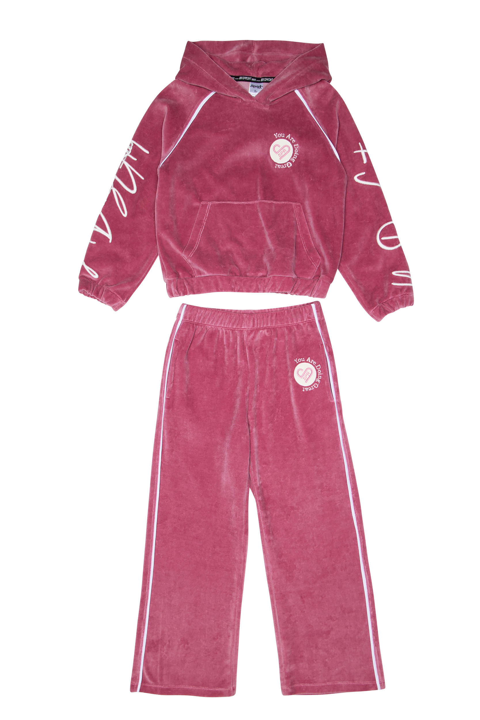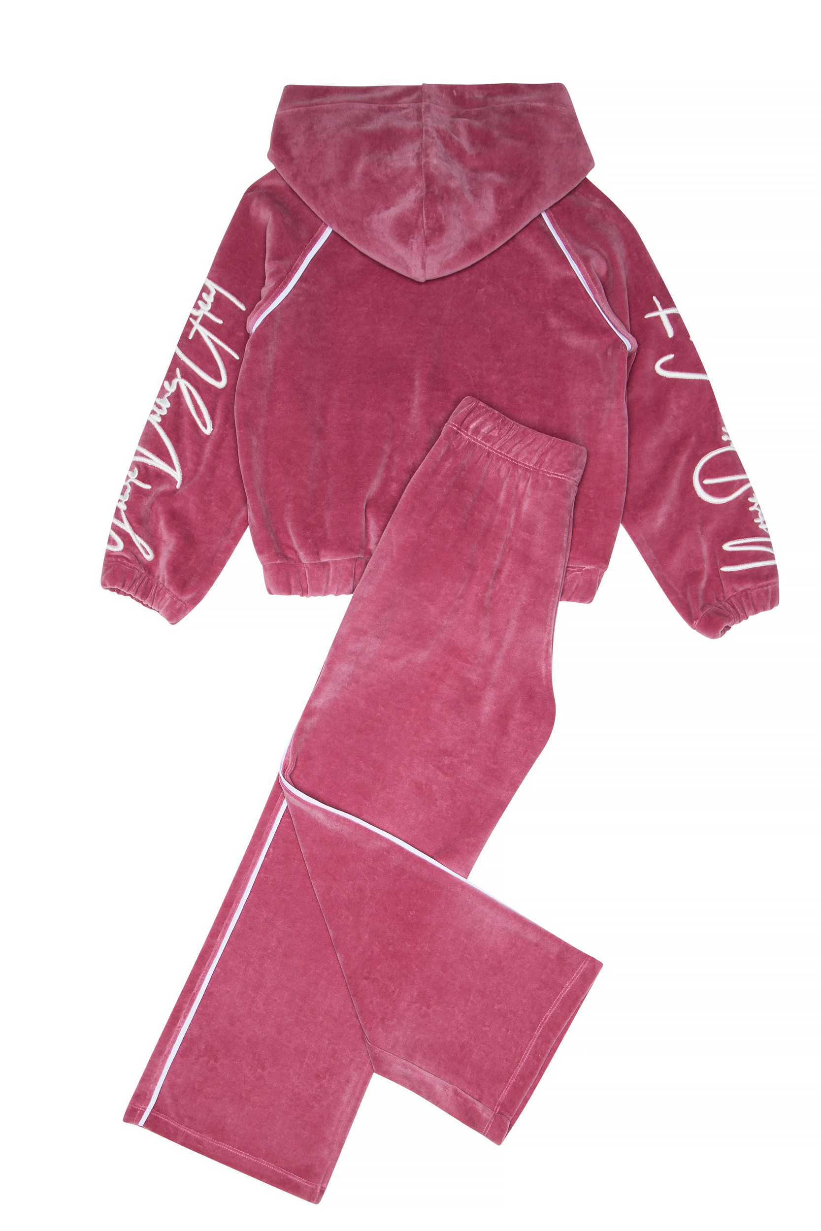 • Παιδικό σετ 2 τεμαχίων βελουτέ. Μπλούζα με κουκούλα και τσέπη με κέντημα στα μανίκια με ανάγλυφη υφή και λεπτομέρεια δίχρωμη στις ραφές. Ίσιο παντελόνι με ελαστικό ζωνάρι με πλαϊνές τσέπες και κέντημα.