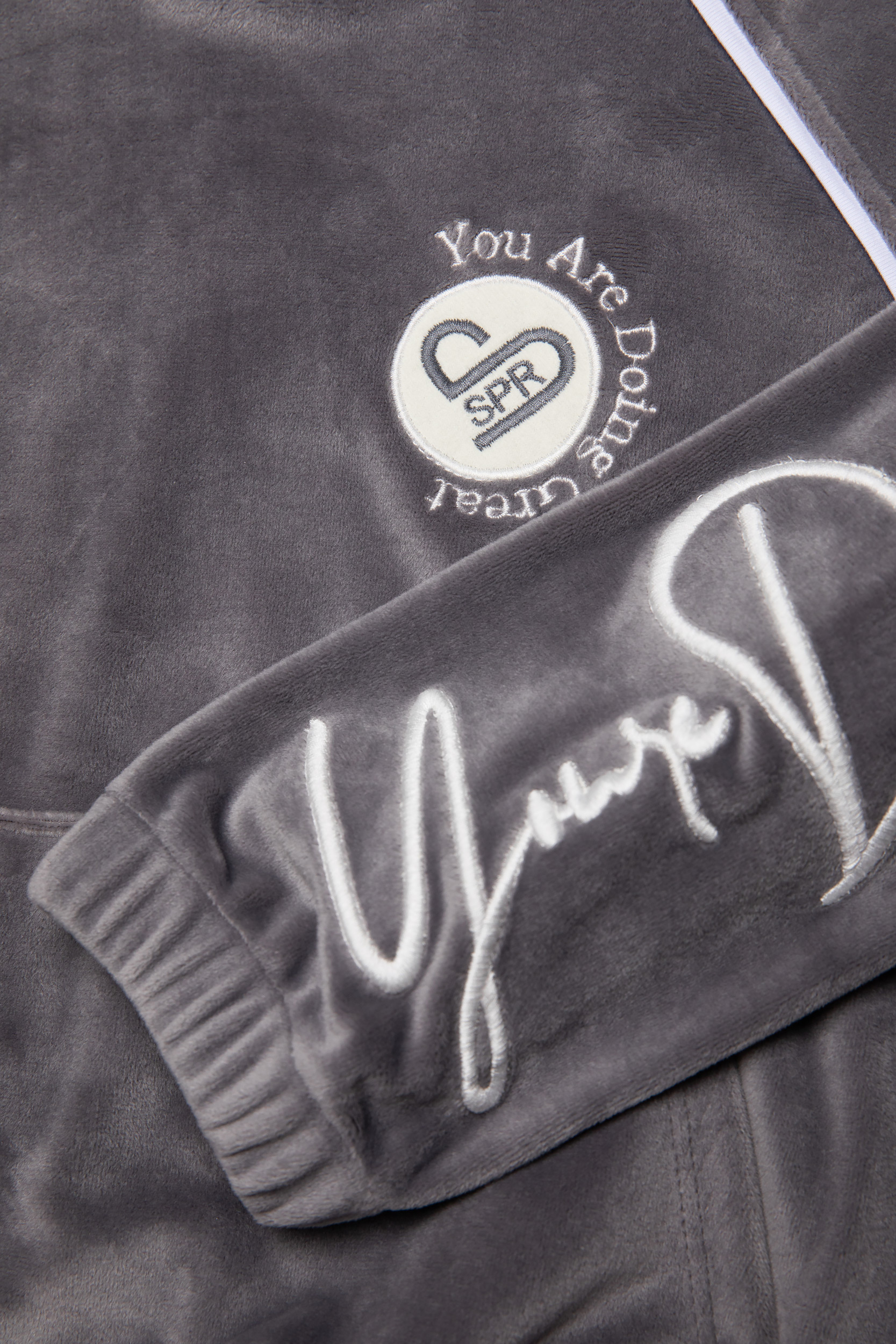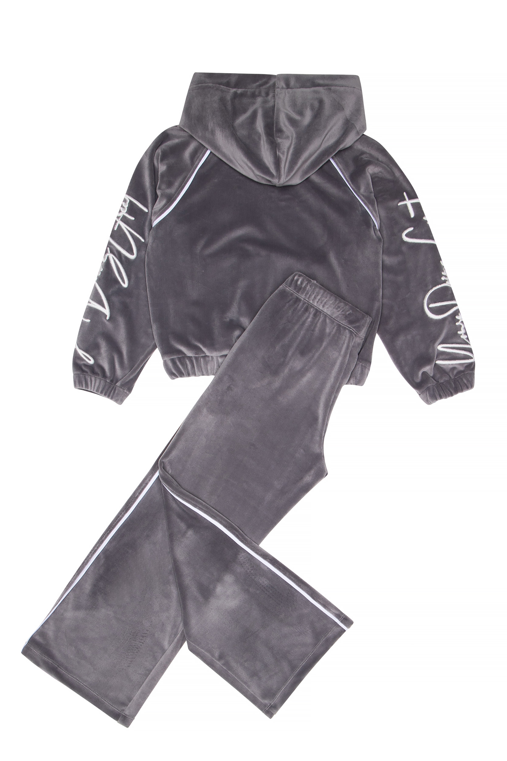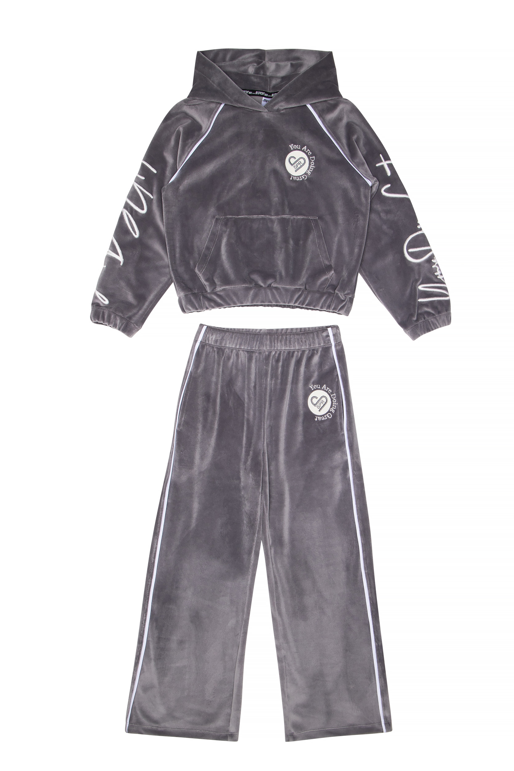 • Παιδικό σετ 2 τεμαχίων βελουτέ. Μπλούζα με κουκούλα και τσέπη με κέντημα στα μανίκια με ανάγλυφη υφή και λεπτομέρεια δίχρωμη στις ραφές. Ίσιο παντελόνι με ελαστικό ζωνάρι με πλαϊνές τσέπες και κέντημα.