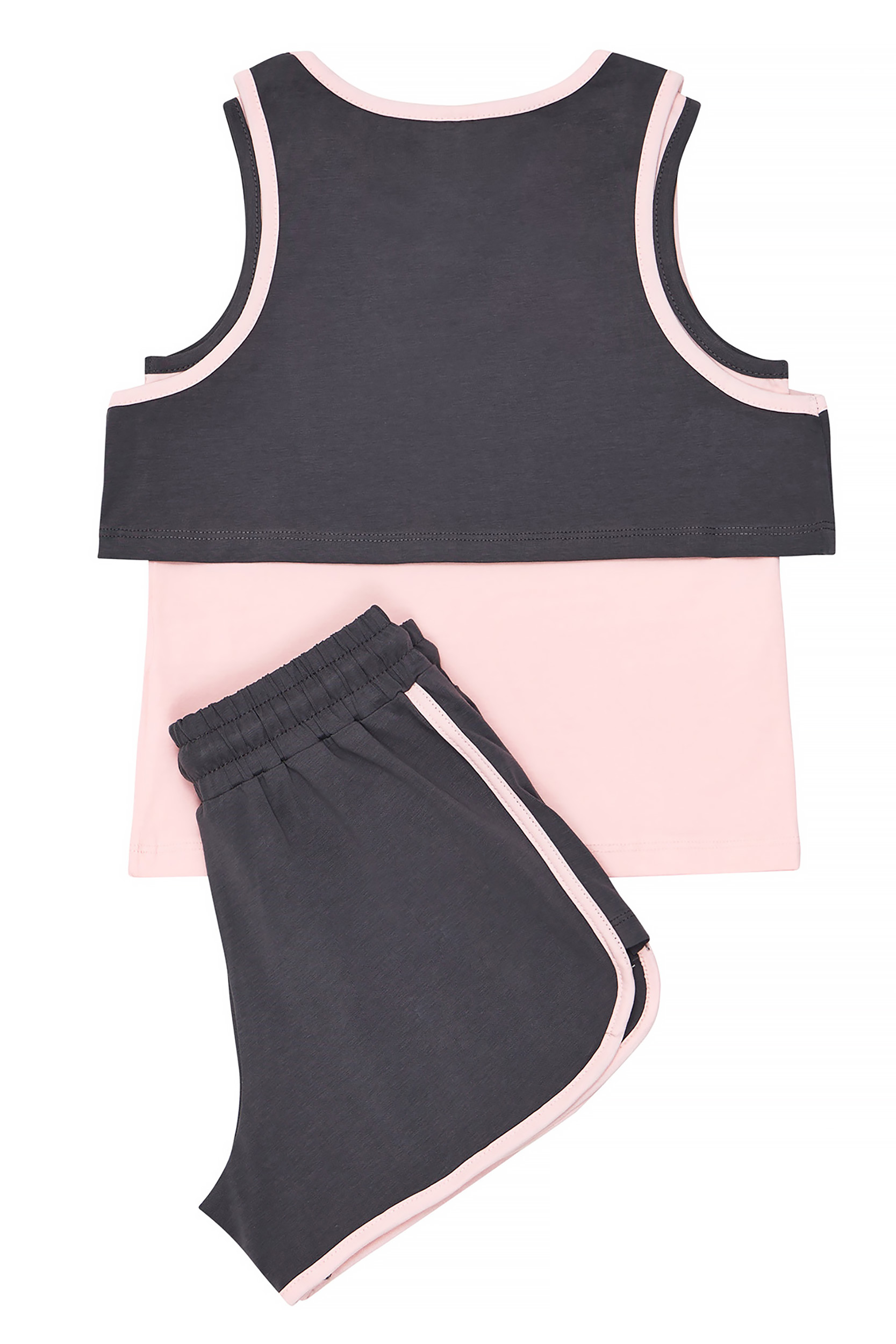 - Παιδικό σετ 3 τεμαχίων λύκρα. Διπλή μπλούζα με rubber ανάφλυφο τύπωμα -Athletic Sprint- στο στήθος. Αθλητικό σόρτς με ελαστικό ζωνάρι και ρυθμιζόμενα κορδόνια με μπροστινές λοξές τσέπες και τύπωμα. Δίχρωμες φάσες ολόγυρα.