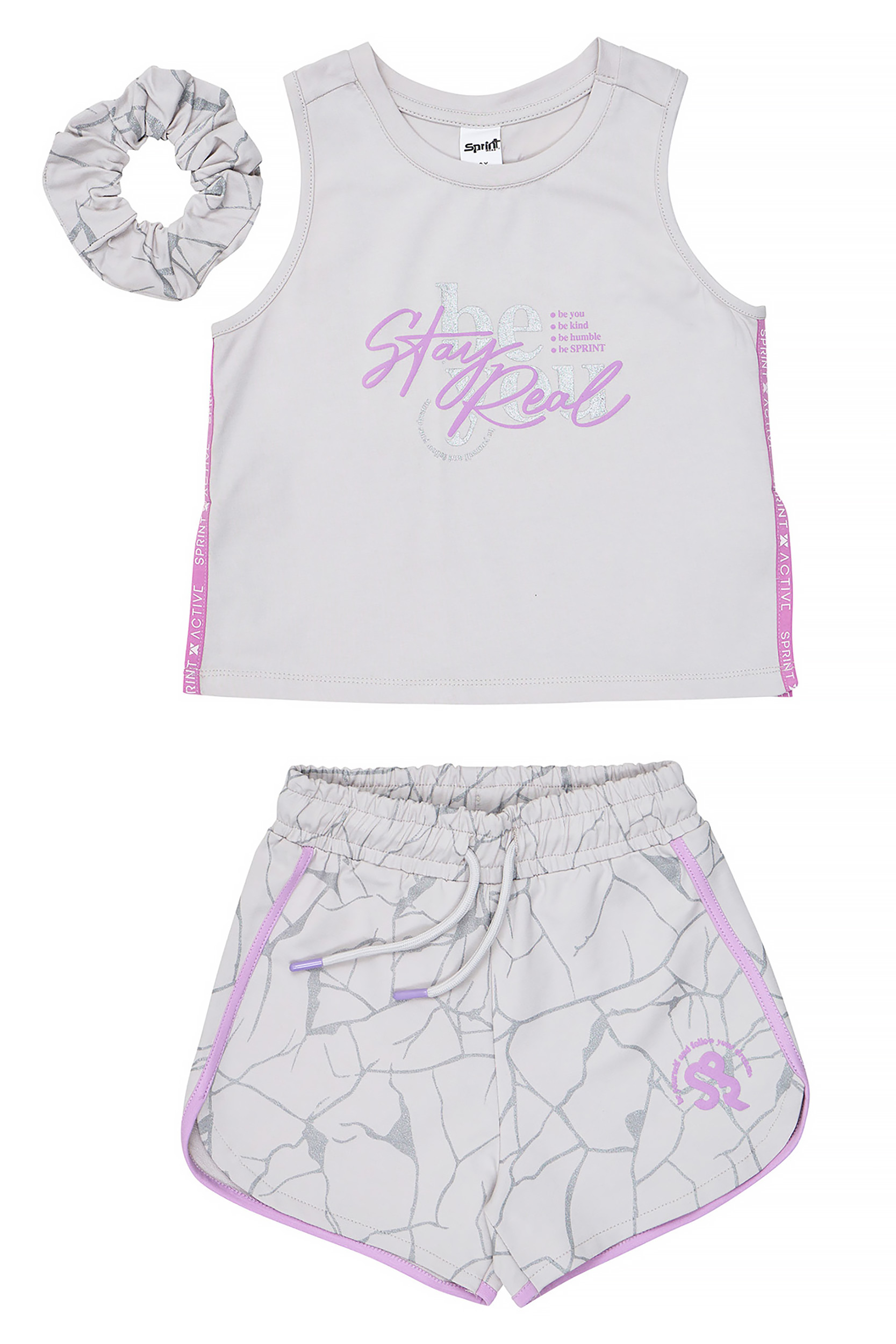 - Παιδικό σετ 2 τεμαχίων. Μπλούζα αμάνικη λύκρα με ανάγλυφο τύπωμα “Stay Real” στο στήθος με silver λεπτομέρεια και λογότυπο Sprint στην πλάτη και δίχρωμη active τρέσα στο πλάι. Αξεσουάρ λαστιχάκι μαλλιών. Σόρτς φούτερ με ελαστικό ζωνάρι και ρυθμιζόμενα κορδόνια, αθλητικές φάσες σε χρωματική αντίθεση και all-over silver γεωμετρικό “crackled” μοτίβο.