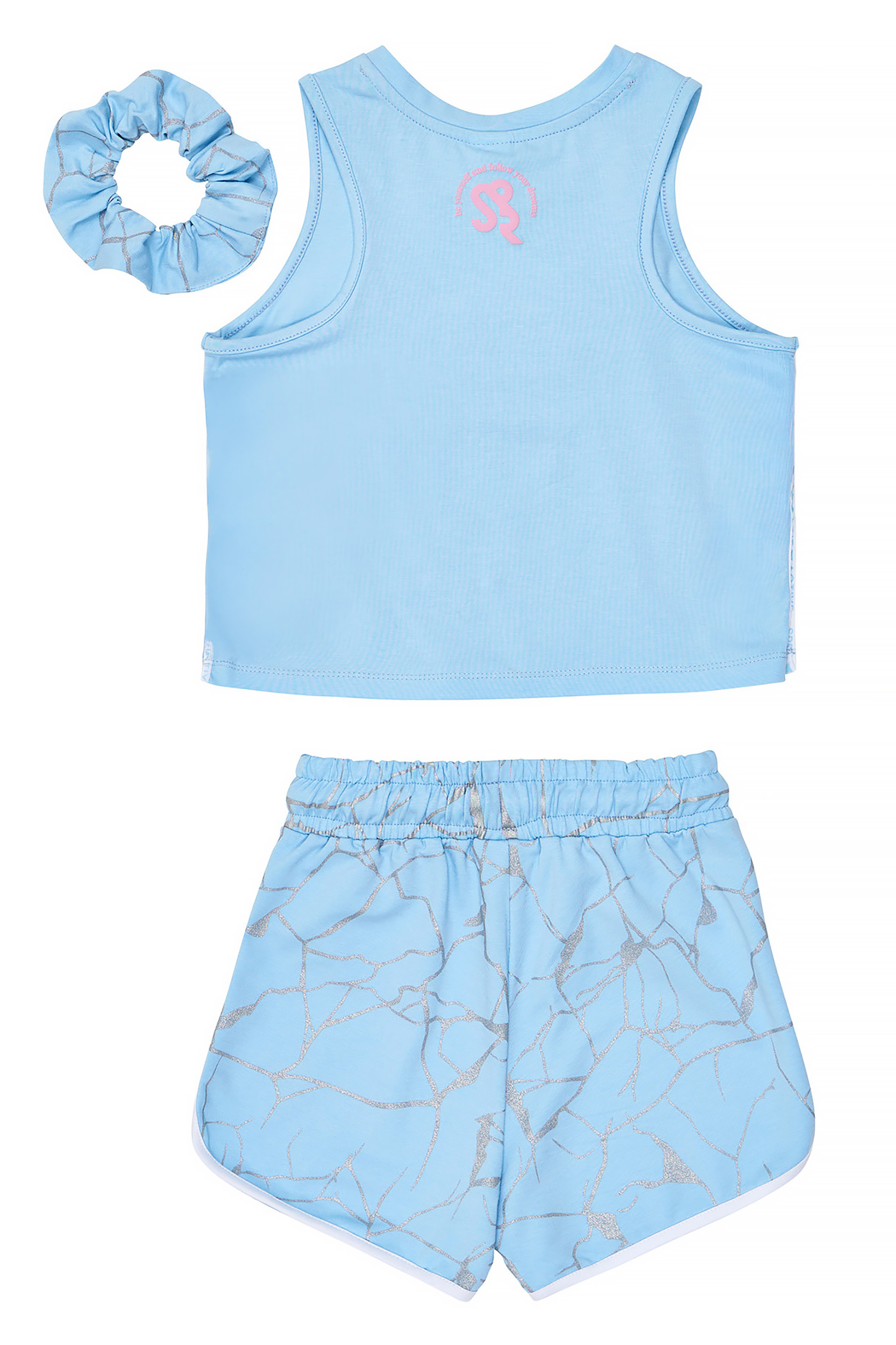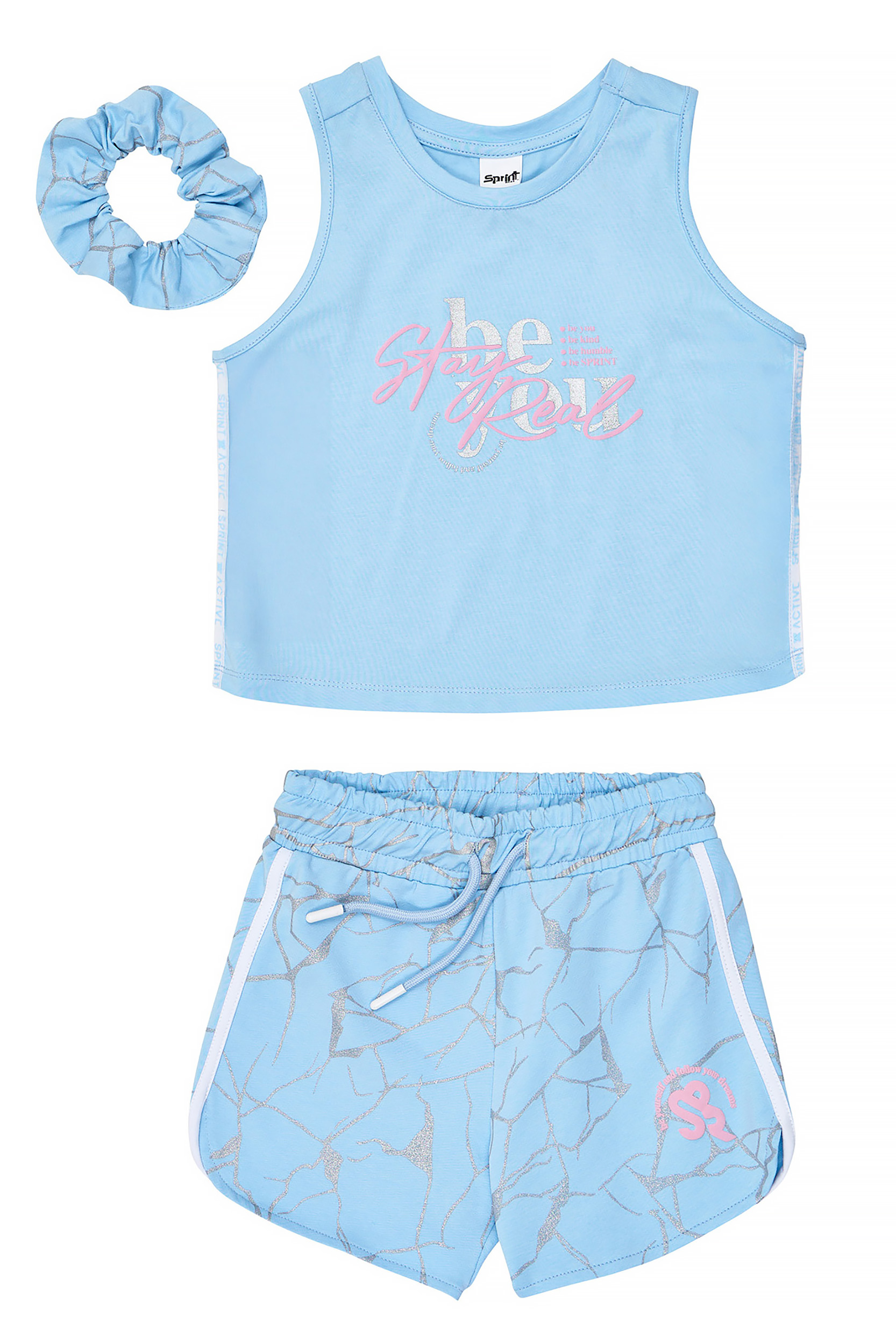 • Παιδικό σετ 2 τεμαχίων. Μπλούζα αμάνικη λύκρα με ανάγλυφο τύπωμα “Stay Real” στο στήθος με silver λεπτομέρεια και λογότυπο Sprint στην πλάτη και δίχρωμη active τρέσα στο πλάι. Αξεσουάρ λαστιχάκι μαλλιών. Σόρτς φούτερ με ελαστικό ζωνάρι και ρυθμιζόμενα κορδόνια, αθλητικές φάσες σε χρωματική αντίθεση και all-over silver γεωμετρικό “crackled” μοτίβο.