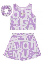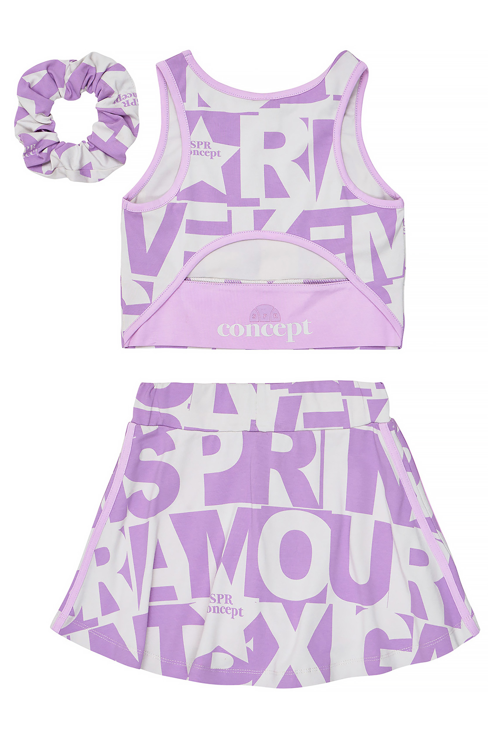 • Παιδικό σετ 2 τεμαχίων λύκρα τύπου τέννις. Μπλούζα σε αθλητική γραμμή αμάνικη με all-over print και ετικέτα εμπρός, διπλή φάσα στο κάτω μέρος ολόγυρα και άνοιγμα στην πλάτη. Αξεσουάρ λαστιχάκι μαλλιών. Σορτς-Φούστα (Skort) με ασορί μοτίβο και ελαστικό ζωνάρι, αθλητικές δίχρωμες φάσες και ενσωματωμένο σορτς εσωτερικά.