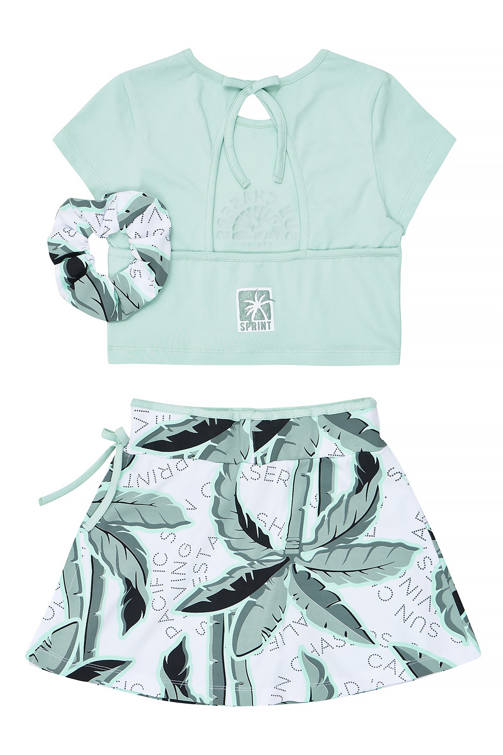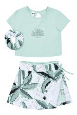 - Παιδικό σετ 2 τεμαχίων λύκρα. Μπλούζα με ανάγλυφο τύπωμα glitter “Sun Chasers” εμπρός και πίσω, και διακριτικό άνοιγμα στην πλάτη με διακοσμητικό δέσιμο. Αξεσουάρ λαστιχάκι μαλλιών. Σορτς-Φούστα (Skort) με άνοιγμα και ελαστικό ζωνάρι, all-over palm print και ενσωματωμένο σορτς εσωτερικά με τύπωμα.