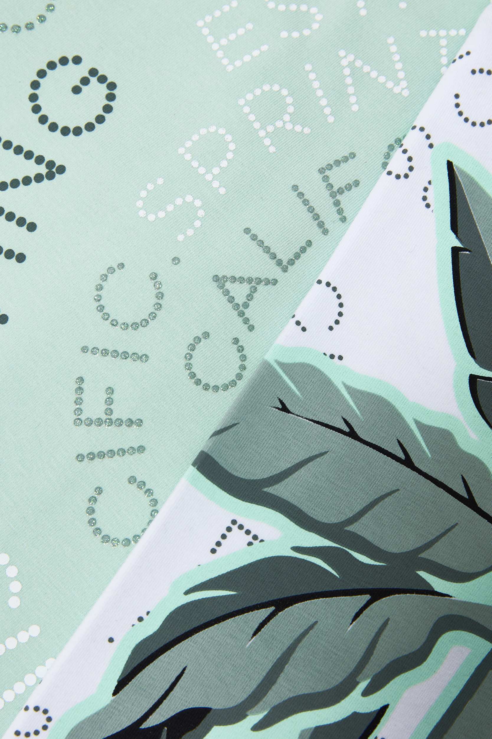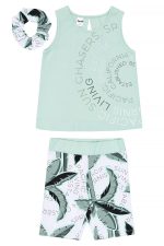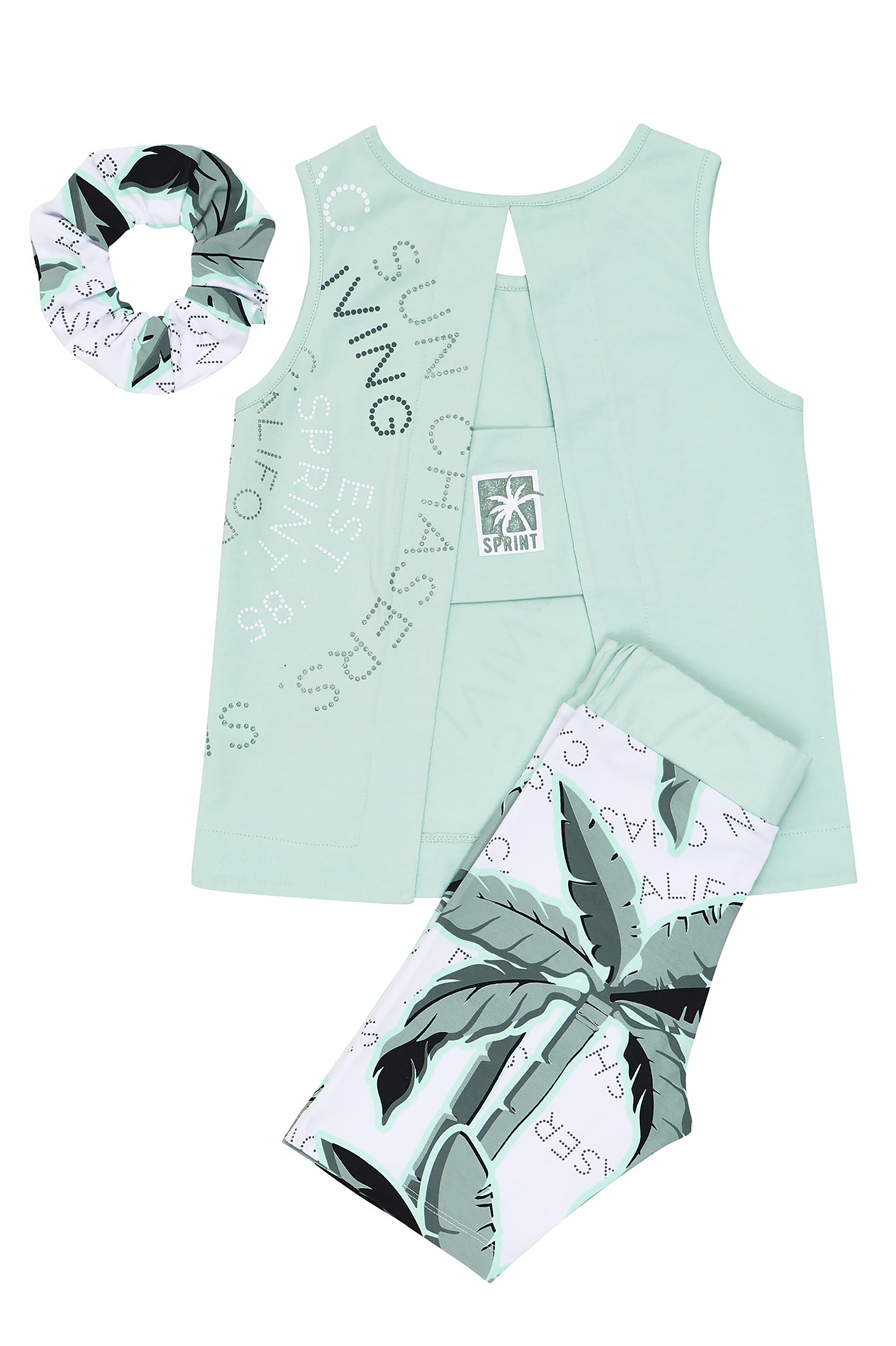 • Παιδικό σετ 2 τεμαχίων λύκρα. Μπλούζα αμάνικη με ανάγλυφο κυκλικό τύπωμα glitter “Sun Chasers” εμπρός και πίσω με άνοιγμα στην πλάτη. Αξεσουάρ λαστιχάκι μαλλιών. Κολάν ποδηλατικό με ελαστικό ζωνάρι και all-over palm print.